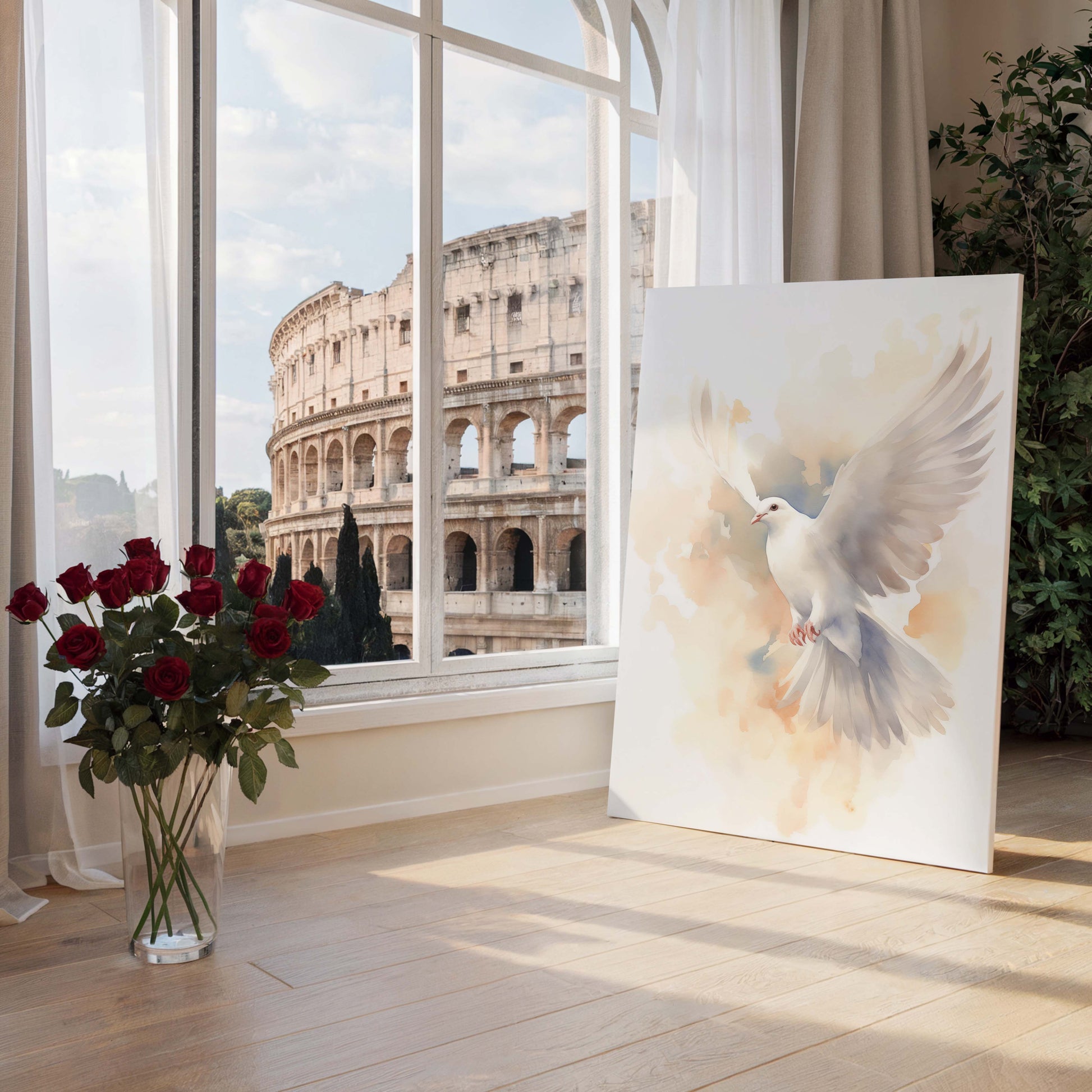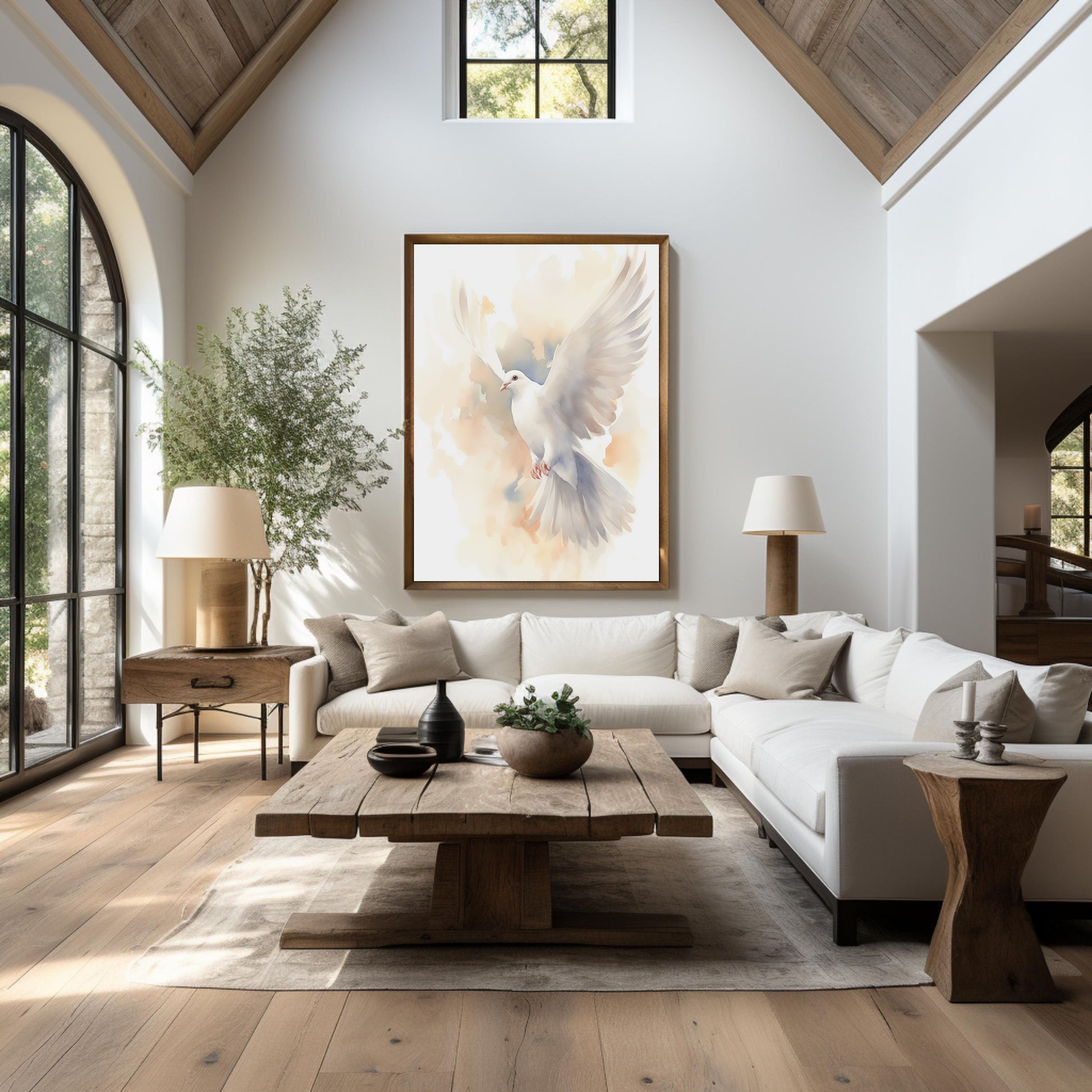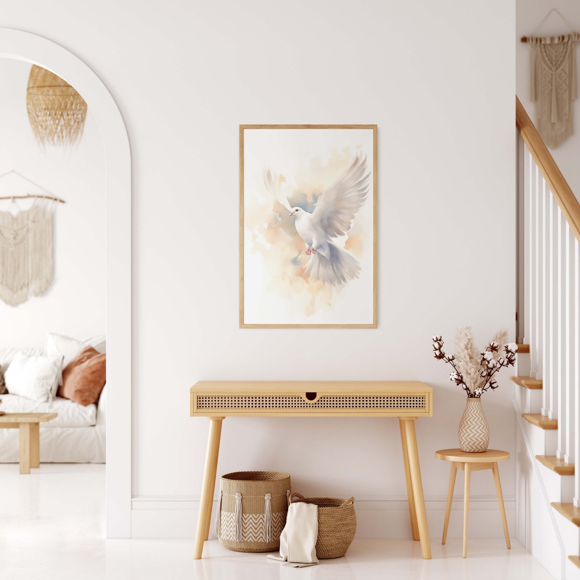 “The Holy Spirit” — This artwork portrays the divine presence as a radiant white dove, gliding gracefully through soft, luminous light. Gentle washes of warm and cool watercolor tones surround the dove, symbolizing peace, purity, and God’s quiet guidance. The serene composition invites reflection, offering a sense of spiritual calm and sacred stillness.