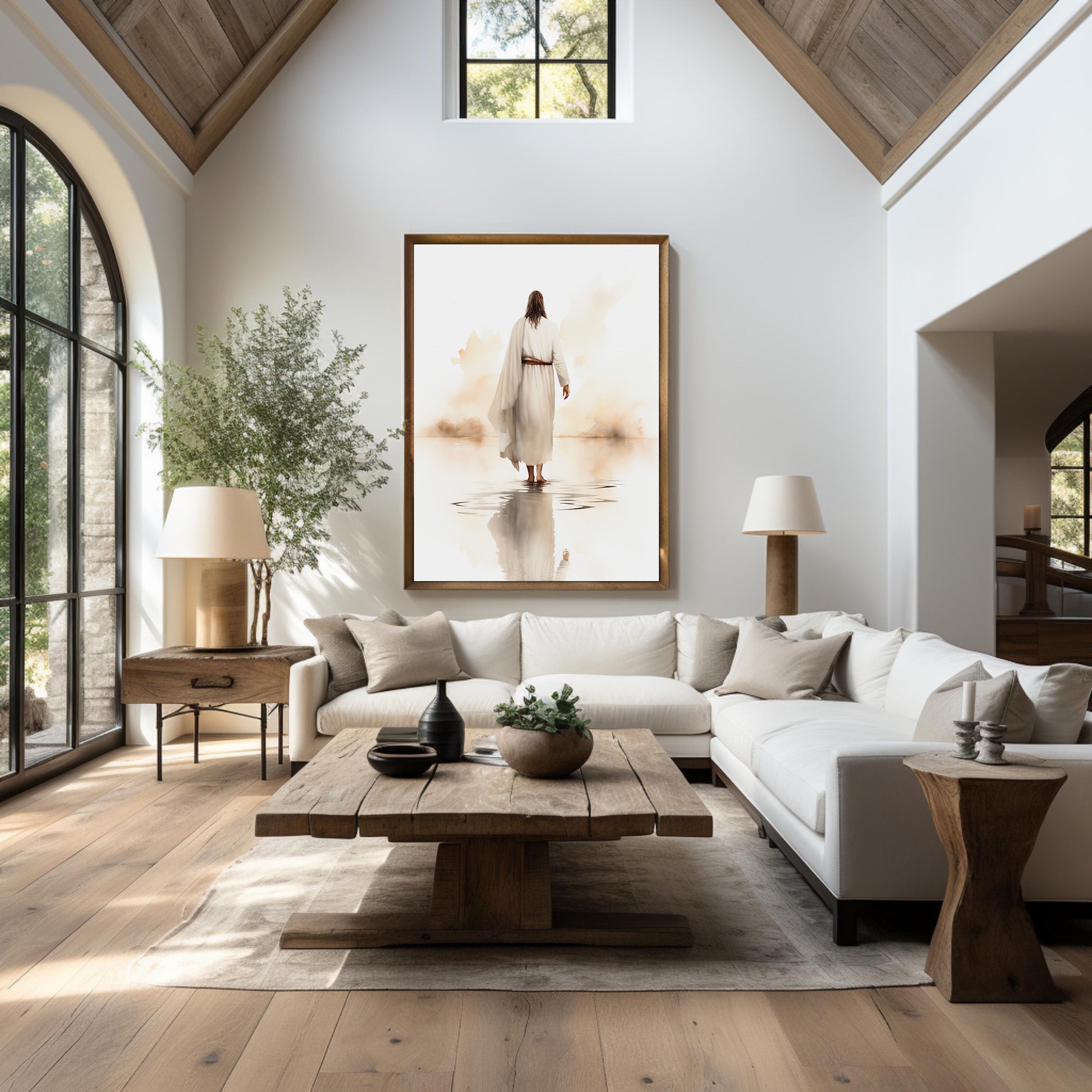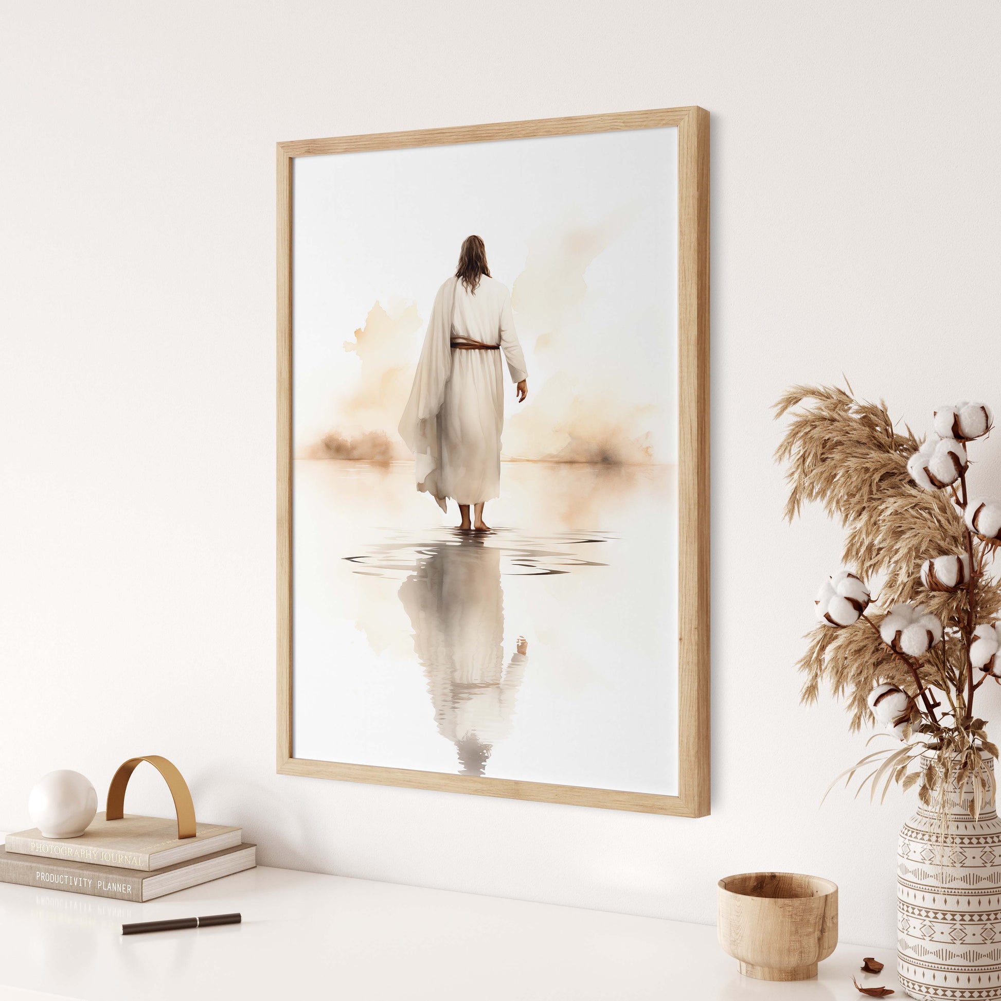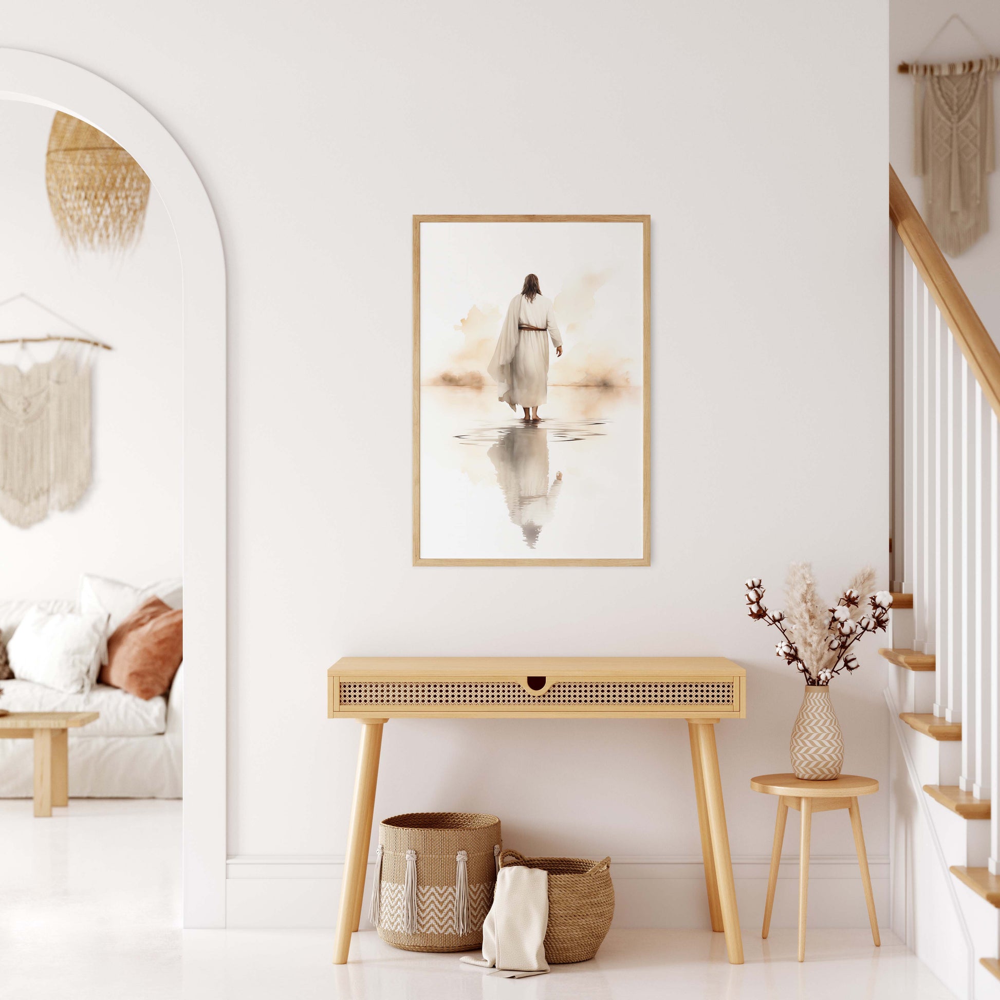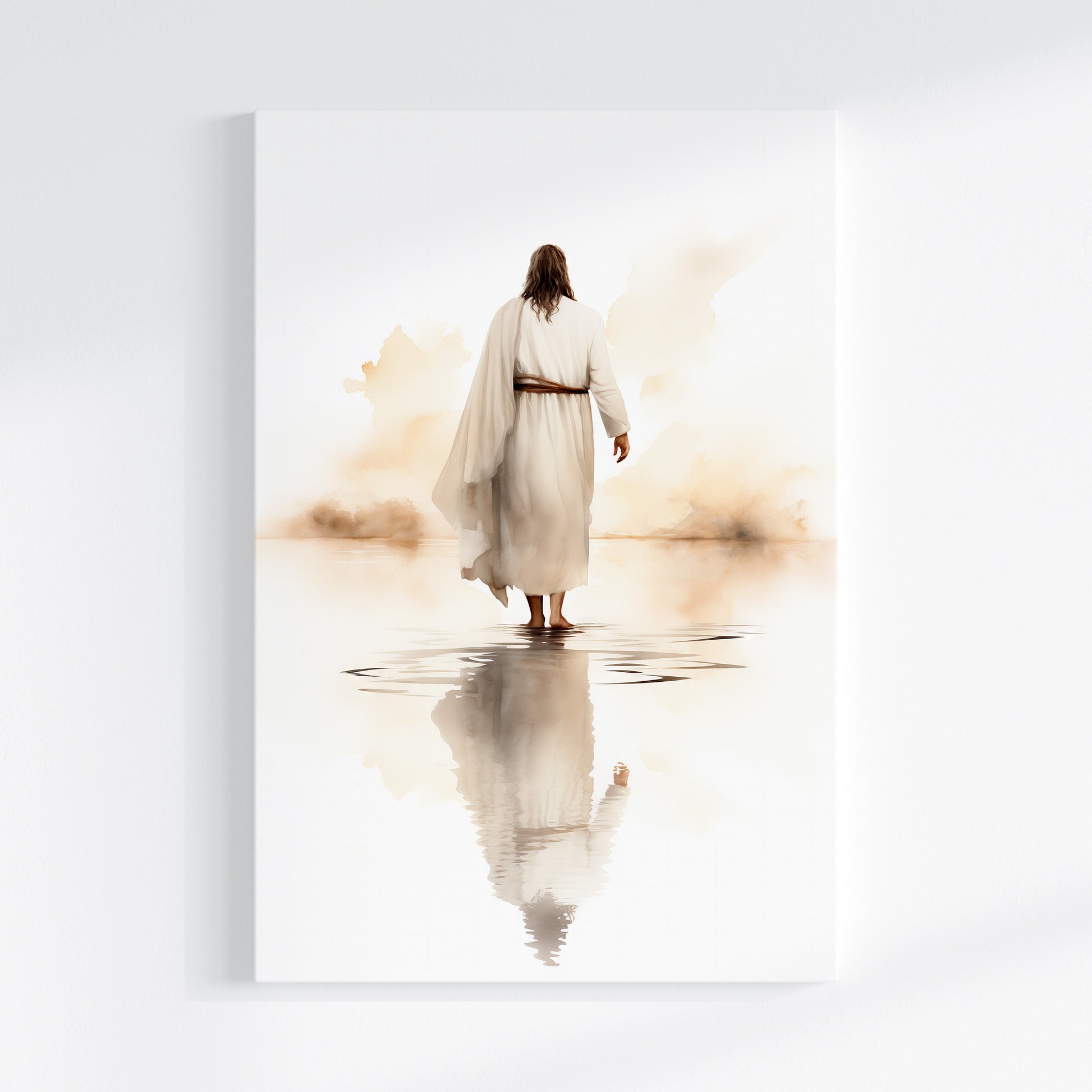 “Jesus Walking on Water” — This minimalist watercolor artwork delicately depicts the miraculous moment when Jesus walks across calm waters. The soft, tranquil tones create a contemplative atmosphere, inviting reflection on Faith, Divine Power, and the enduring strength of Devotion to God.