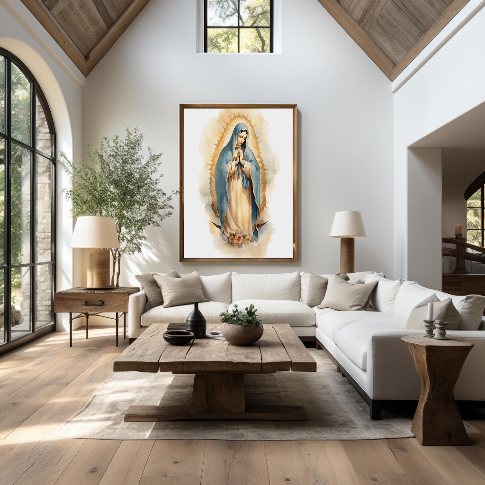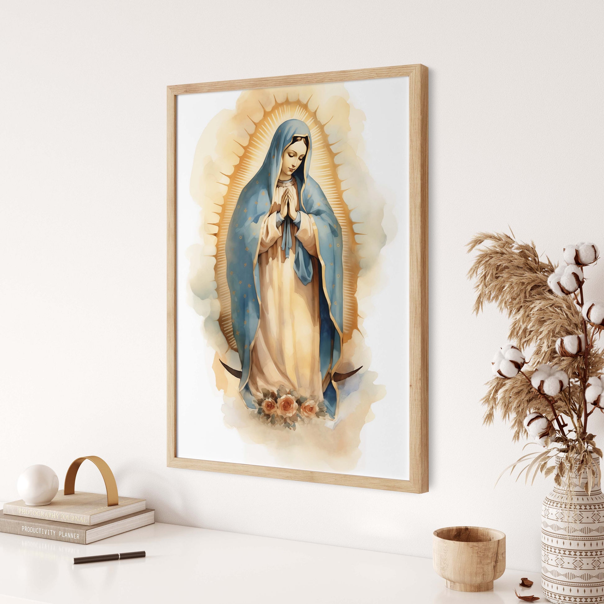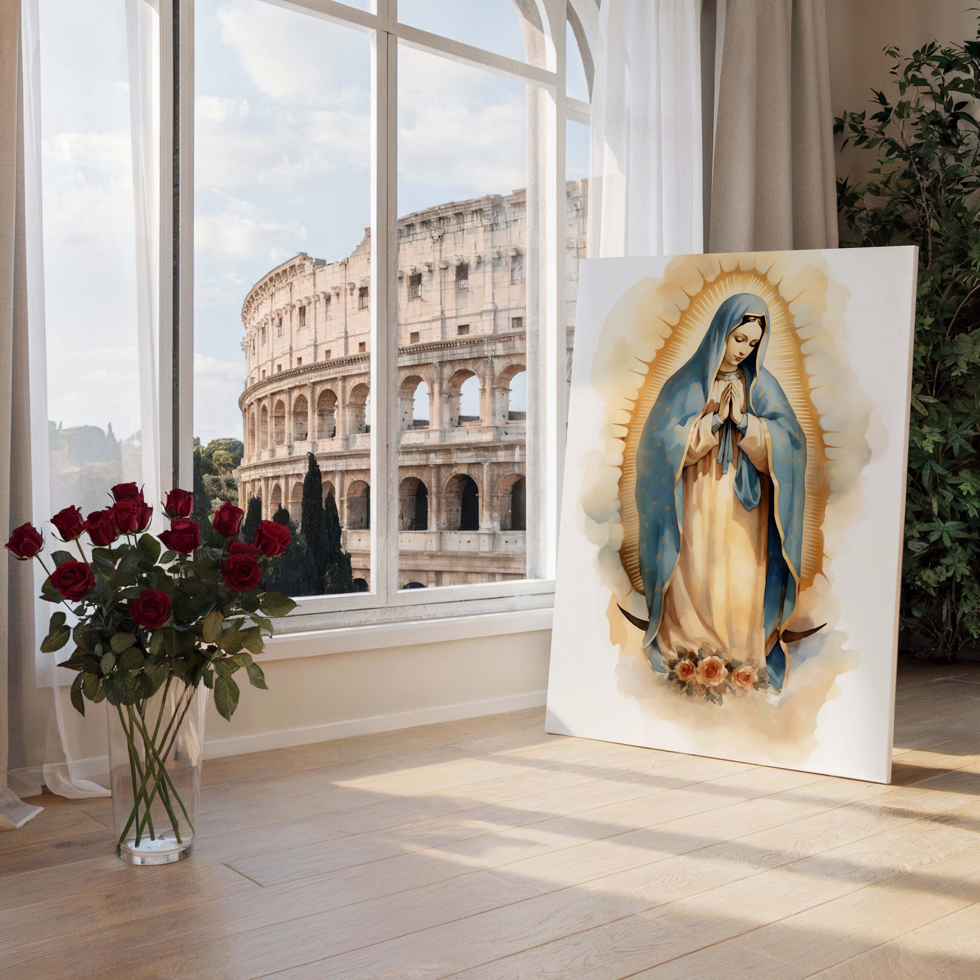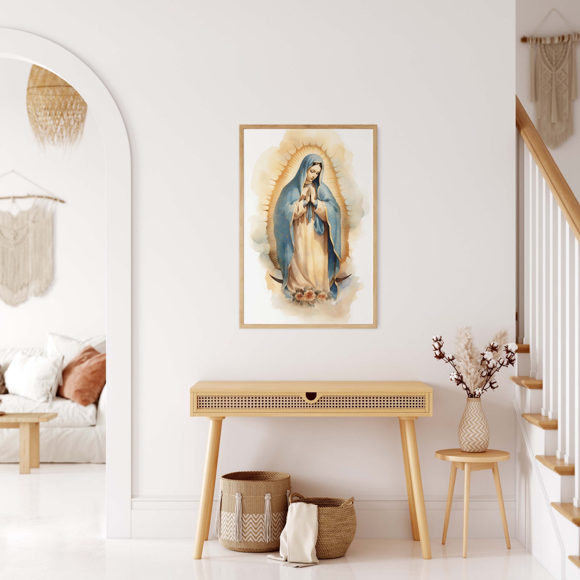 “Virgin de Guadalupe” — portrays the beloved image of Our Lady with soft yet luminous watercolor tones. Staying true to her traditional form, this piece conveys quiet Devotion and Grace, inviting reflection on her enduring Spiritual Presence and the comfort she offers to those who seek her.